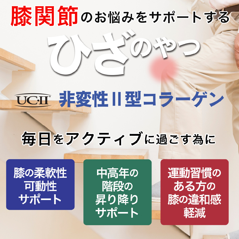 また、中高年の階段の昇り降りをサポートします。2カプセル中に非変性II型コラーゲン(酵素分解水溶化コラーゲンペプチドとして) 2.4mg、Nアセチルグルコサミン 60mg、低分子ヒアルロン酸 60mg、オオイタドリ、筋骨草などを配合しました。