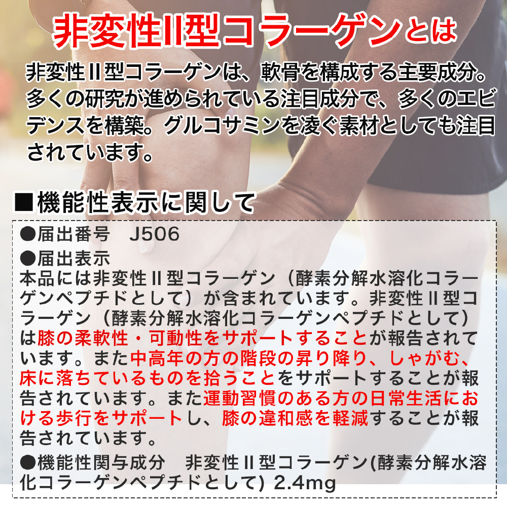 非変性2型コラーゲンを主成分に、ヒアルロン酸、Nアセチルグルコサミン、オオイタドリエキス、筋骨草を配合したサプリメントです。