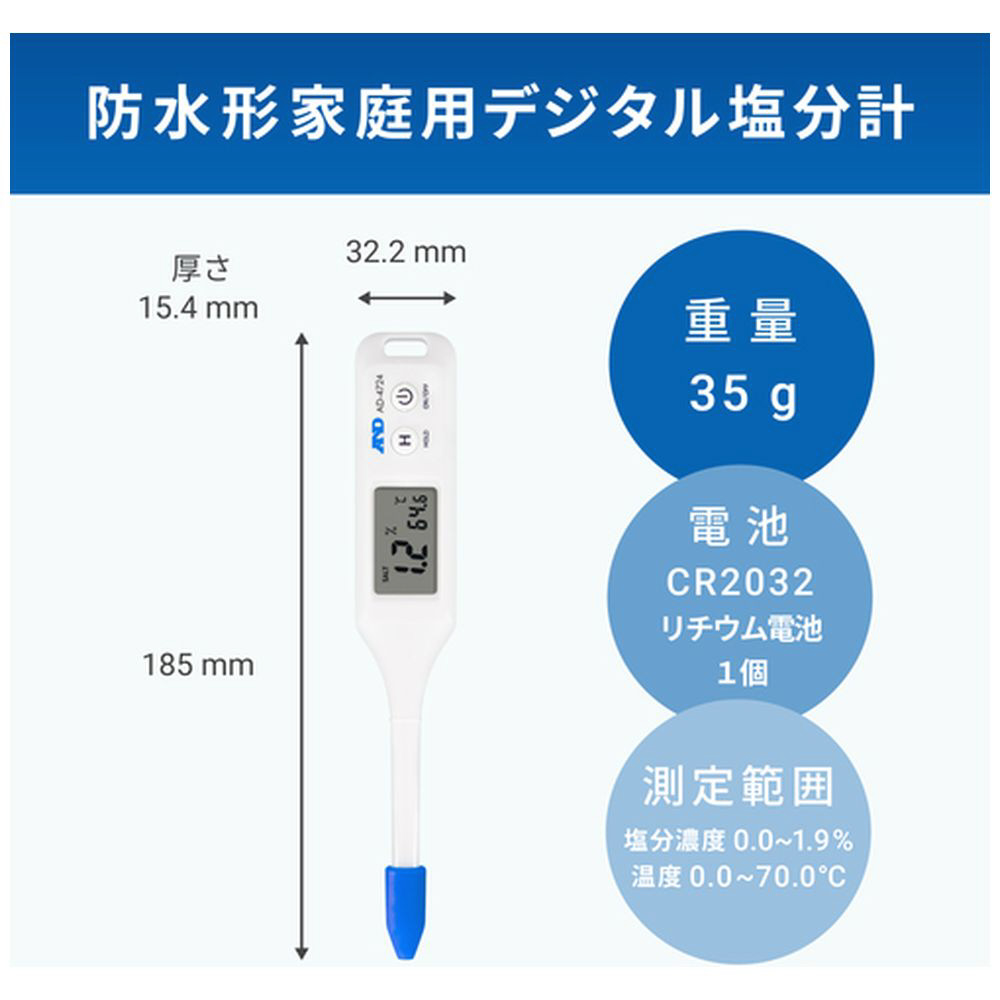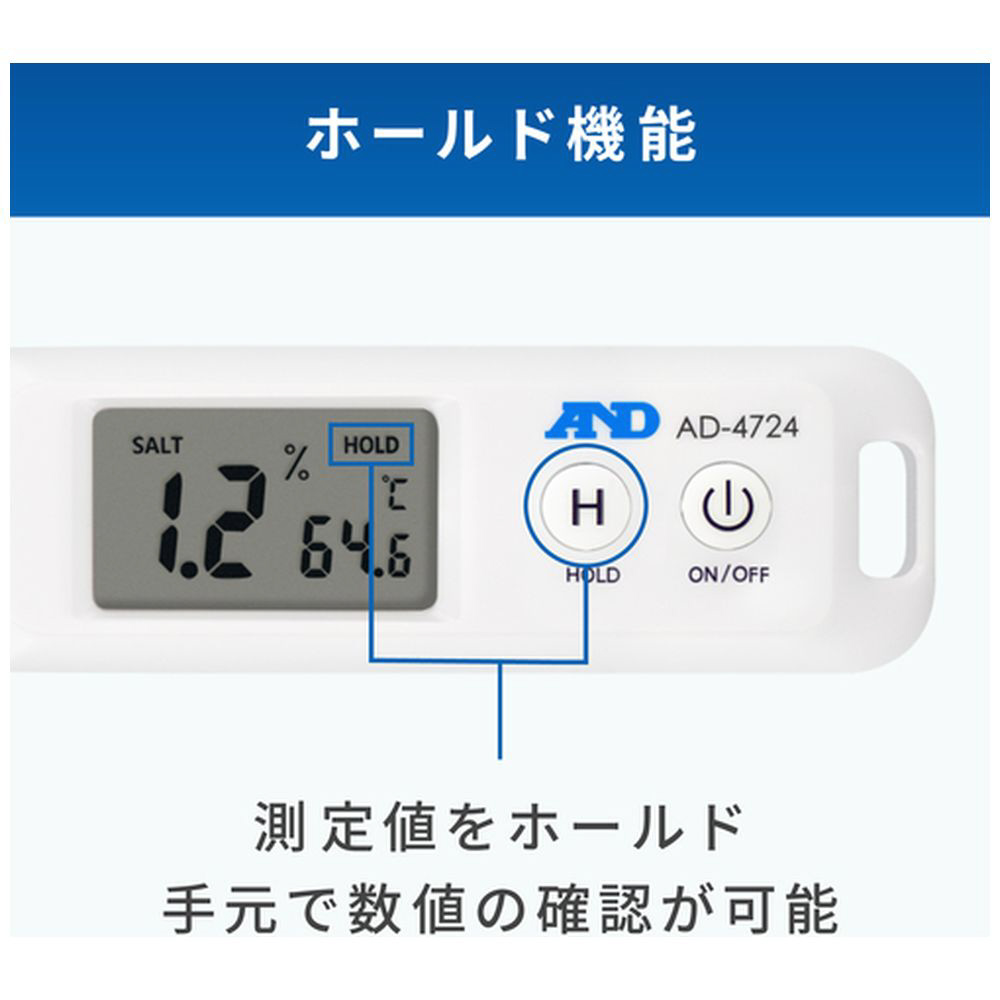 塩分濃度と液体温度を同時に測定、数値でチェック可能です。