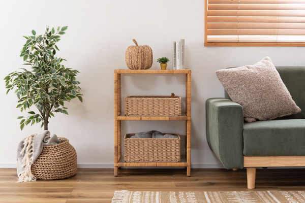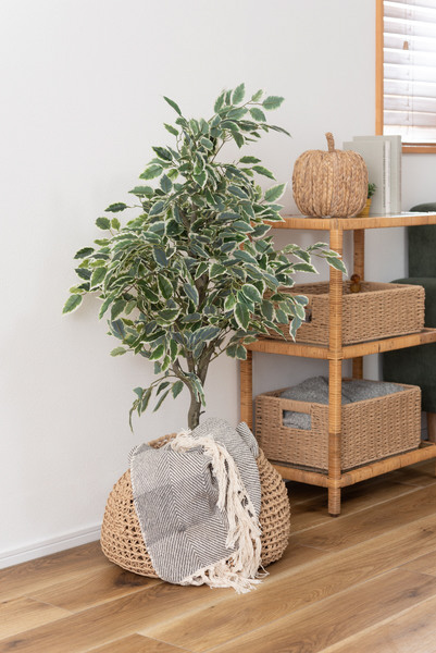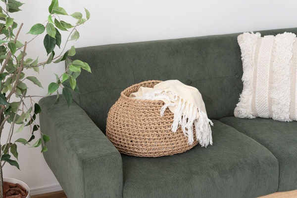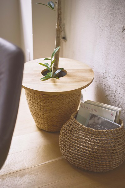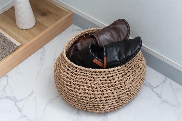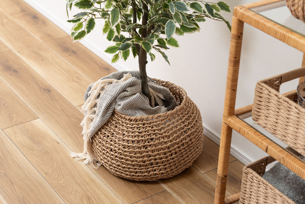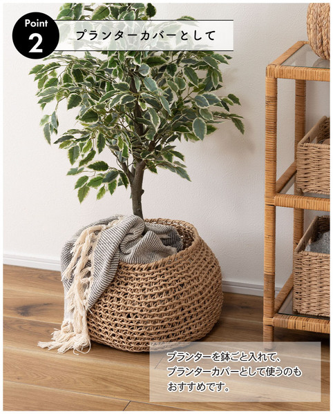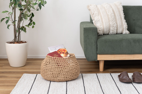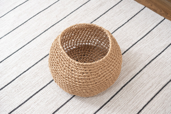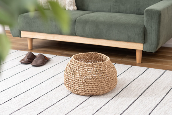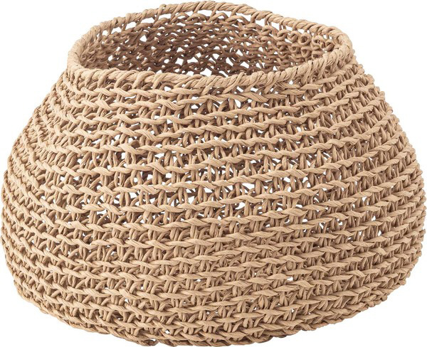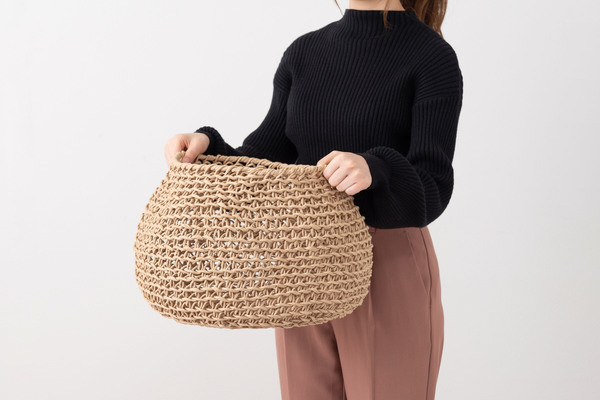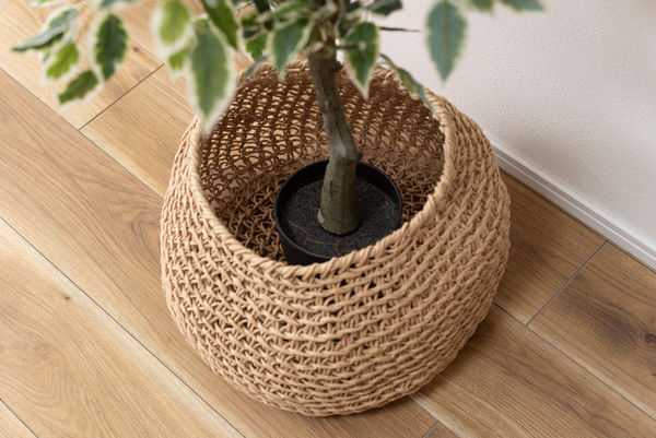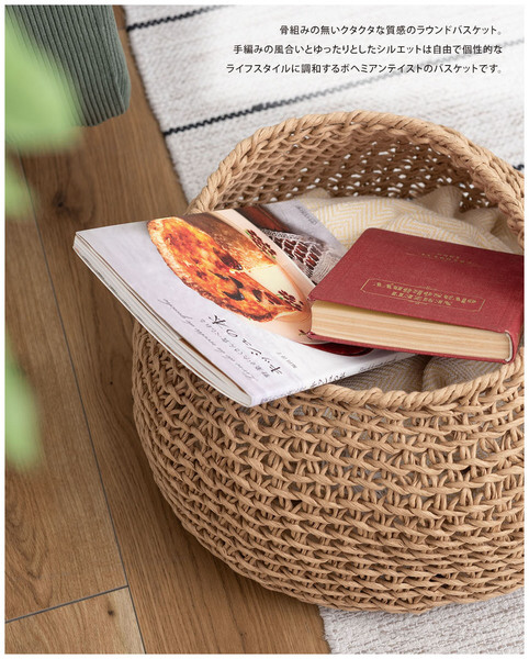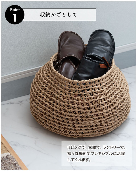 手編みの風合いとゆったりとしたシルエットは自由で個性的なライフスタイルに調和する、ボヘミアンテイストのバスケット。リビングで、玄関で、ランドリーで。収納かごとして様々な場所でフレキシブルに活躍。プランターを鉢ごと入れて、プランターカバーとして使うのもおすすめ。ペーパーコードを編み込んだ素材でくしゃっと出来るほどやわらかい形状。