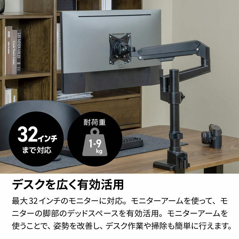 モニターアームを使えば、目線が上がり姿勢の改善につながるだけでなく、デスクでの作業効率アップや掃除も簡単に行えます。