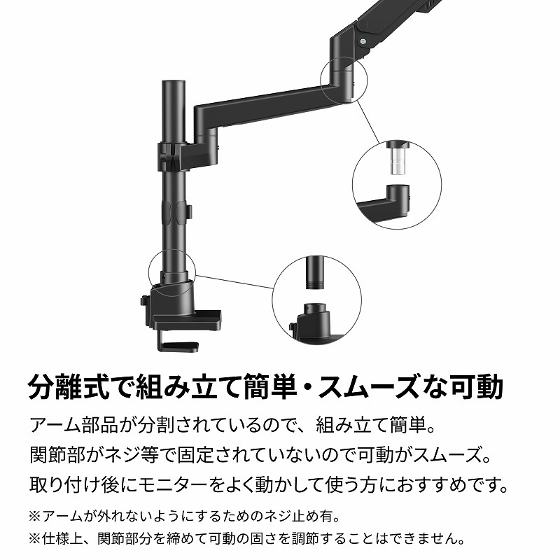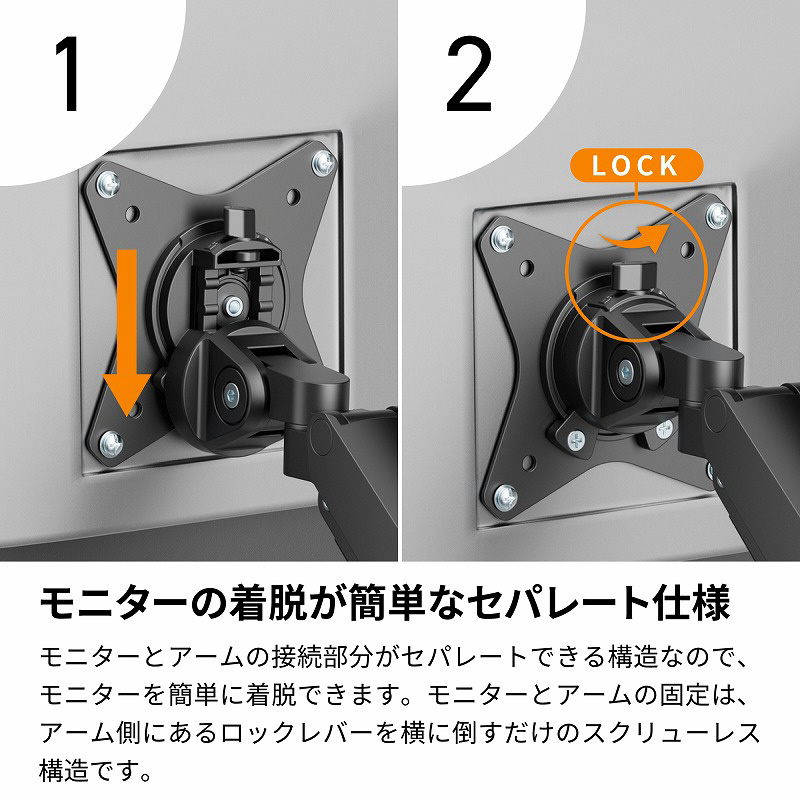 モニターとアームの接続部分がセパレートできる構造なので、モニターを簡単に着脱できます。