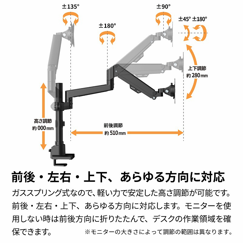 ガススプリング式で前後・左右・上下あらゆる方向に対応。