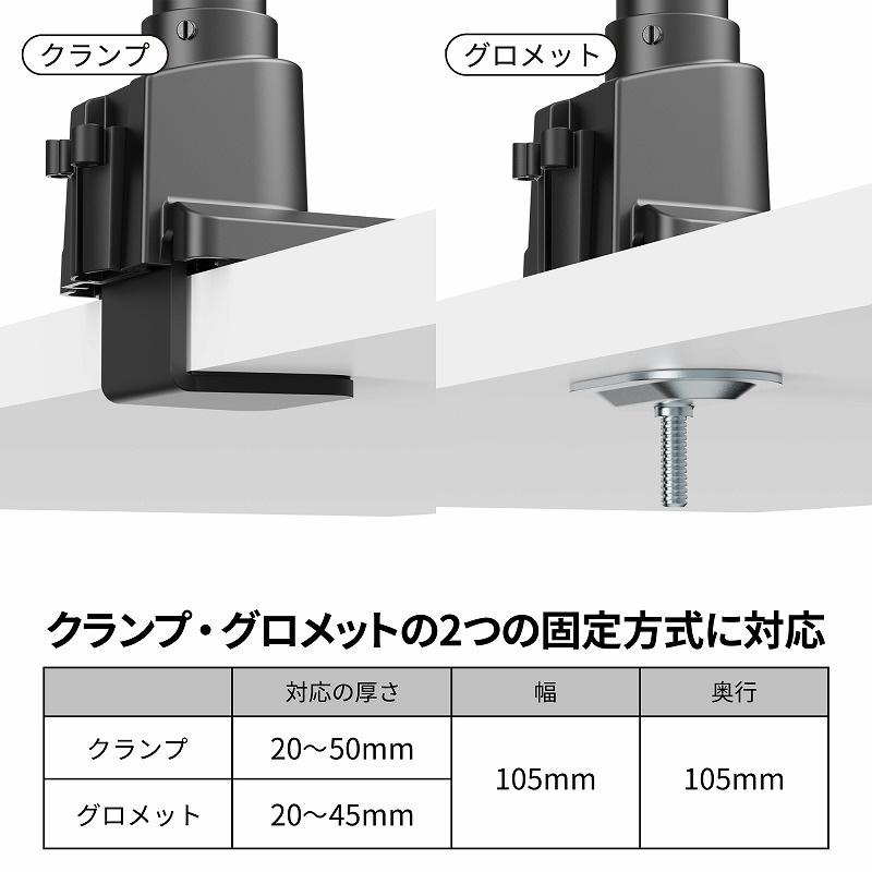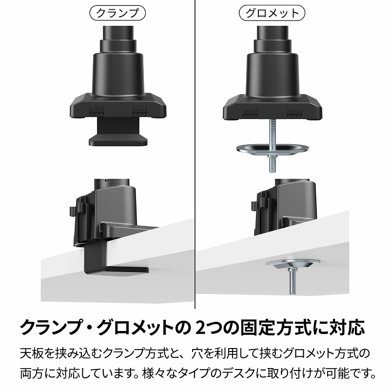 デスクへの取り付けは、しっかりと挟み込むクランプ方式と、デスクの穴を利用して固定するグロメット方式の2種類に対応しています。