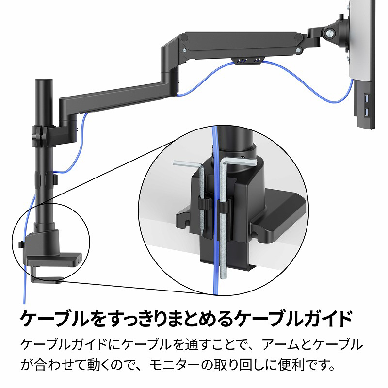 アームにはケーブルガイドが設けられているため、ケーブルをすっきりとまとめることができます。