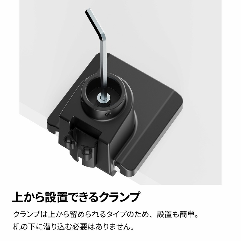 クランプは上から留められるタイプのため設置も簡単。机の下に潜り込む必要はありません。
