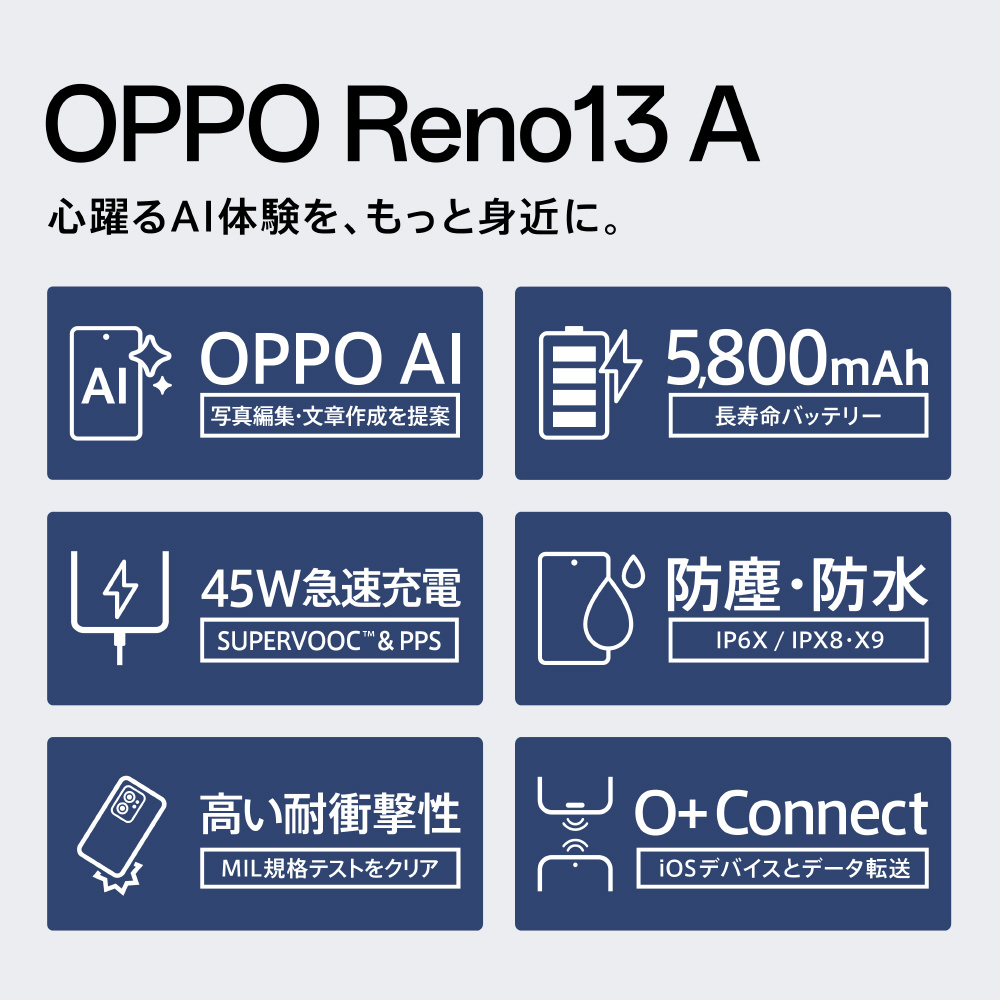 【SIMフリー】OPPO Reno13 A ルミナスネイビー「CPH2699LN」Qualcomm Snapdragon 6 Gen 1 6.7インチ・メモリ/ストレージ:8GB/128GB nanoSIM ×2 eSIM対応【防水・防塵・おサイフケータイ】 ルミナスネイビー