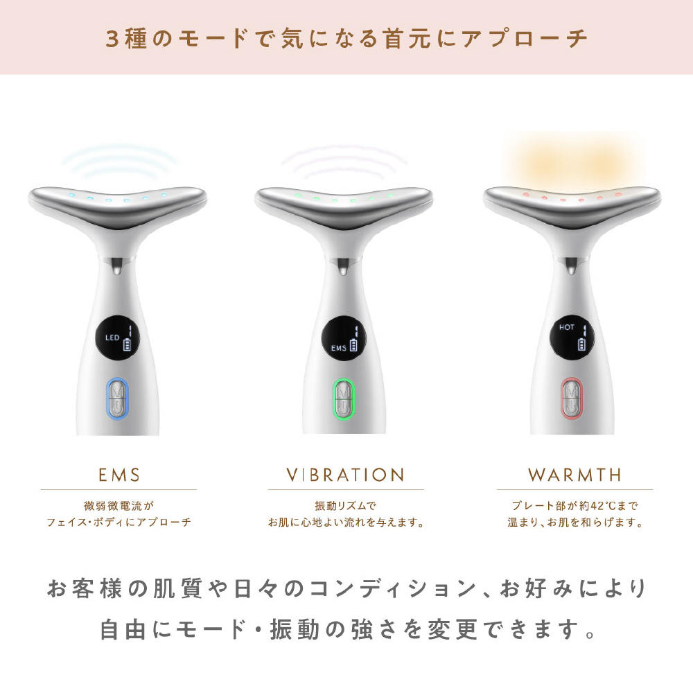 お客様の肌質や日々のコンディション、お好みにより自由にモード・振動の強さを変更できます。