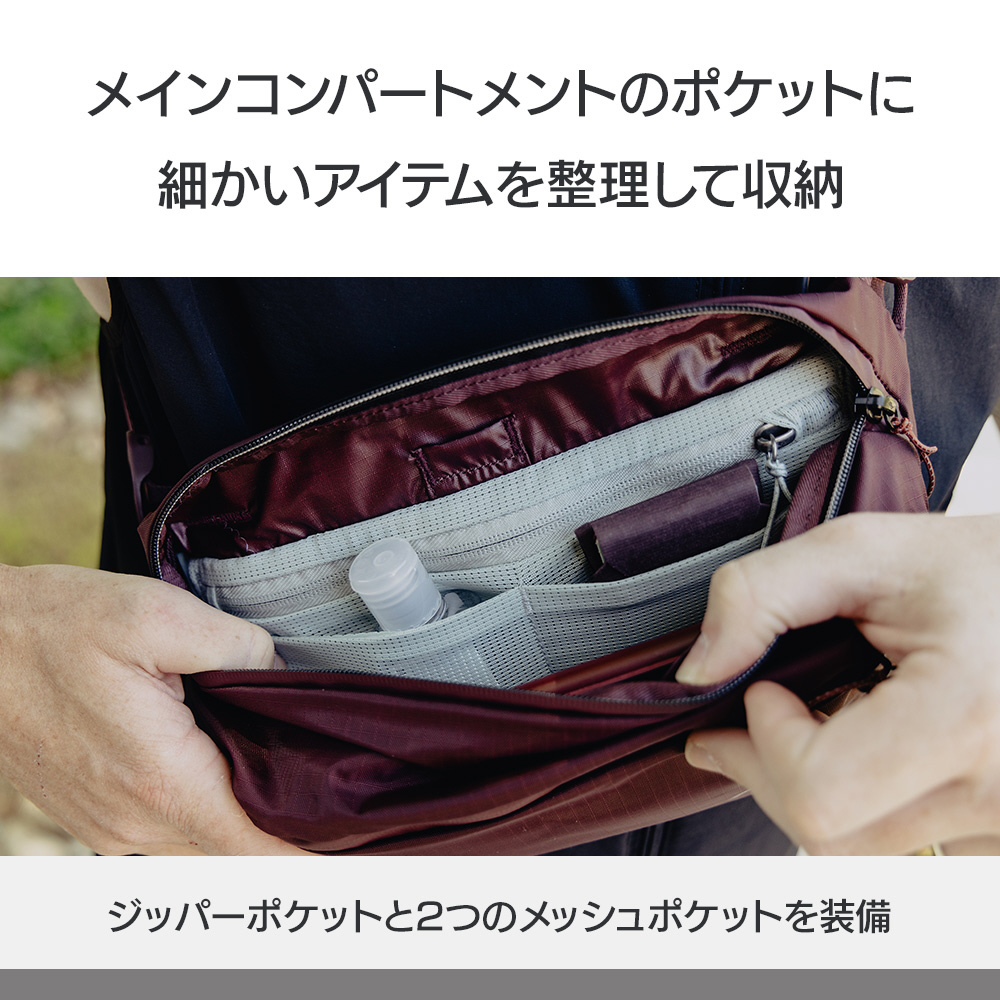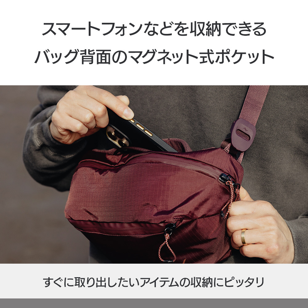 販売中の「アウトドアスリング2L」の洗練されたデザインと、「アウトドアスリング7L」の利便性を取り入れた、新しいモデルです。