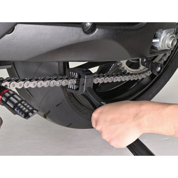●3面ブラシでチェーン汚れを落とす