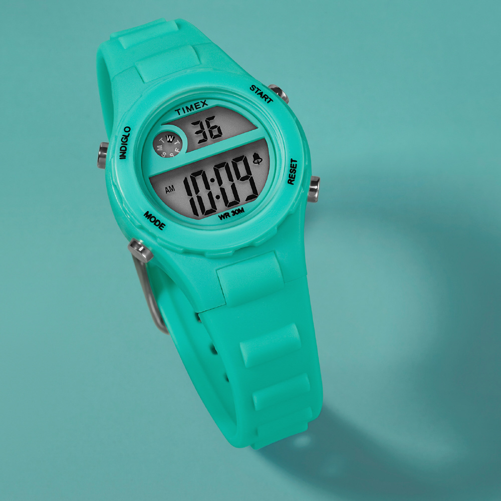 ちょっとレトロなデジタルウォッチはアラームやタイマーのほか、液晶が光るインディグロ機能付き。30m防水なので急な雨や梅雨時に濡れても安心。