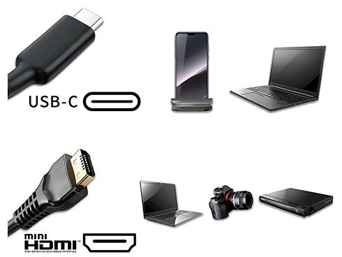■入力端子としてハイブリッド対応(モニターへの電源と映像を1本で送信)のUSB Type-Cを1つと電源供給用のUSB Type-Cを1つ、さらにminiHDMIを1つ装備します。*miniHDMI使用時にはUSB Type-C端子から電源供給が必要になります。