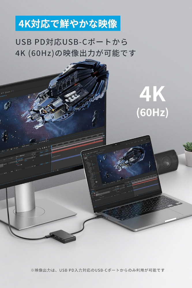 4K (60Hz) 対応・USB PD 100W出力対応 USB-C ポート1つ、高速データ転送用USB-Cポート3つへの接続がこれ一台で可能になりました。(※4K (60Hz) 対応の映像出力は、USB PD対応のUSB-Cポートからのみ利用が可能です。ご使用の機器の互換性を必ずご確認ください)
