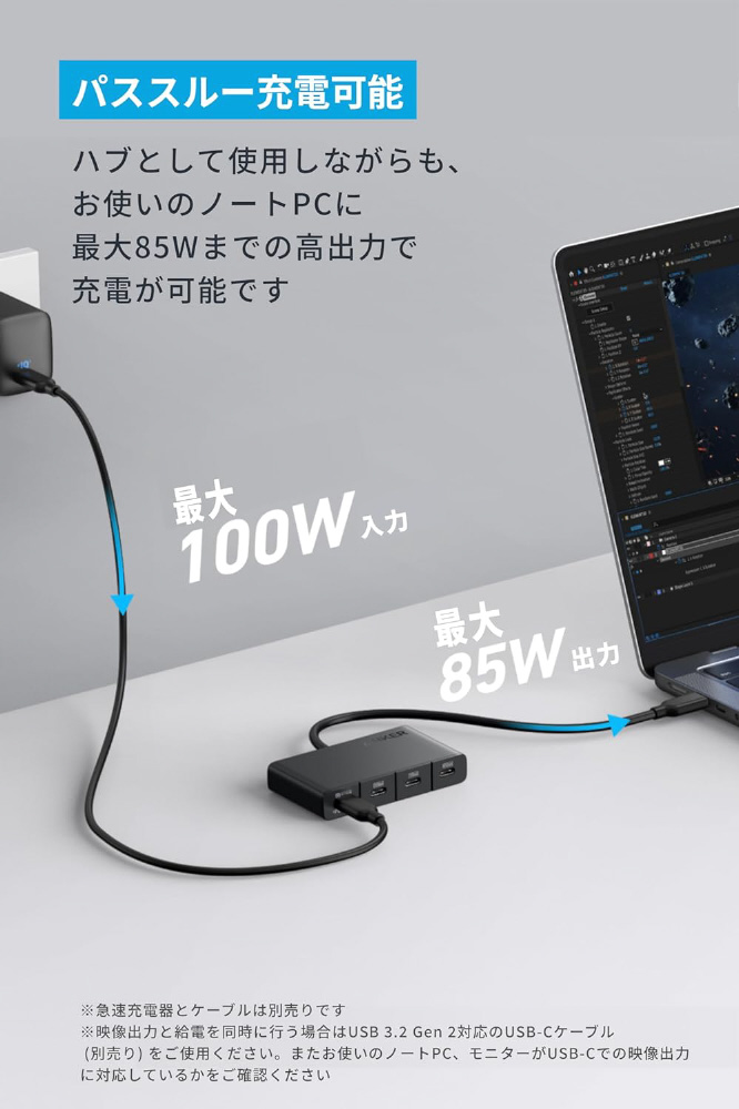 データ転送などハブとして使用しながらも、お使いのノートPCに最大85Wまでの高出力でパススルー充電が可能です。(※85Wでのパススルー充電を行うためには、USB PD 100W出力に対応した急速充電器とケーブルをお使いください。なお、急速充電器とケーブルは別売りです)