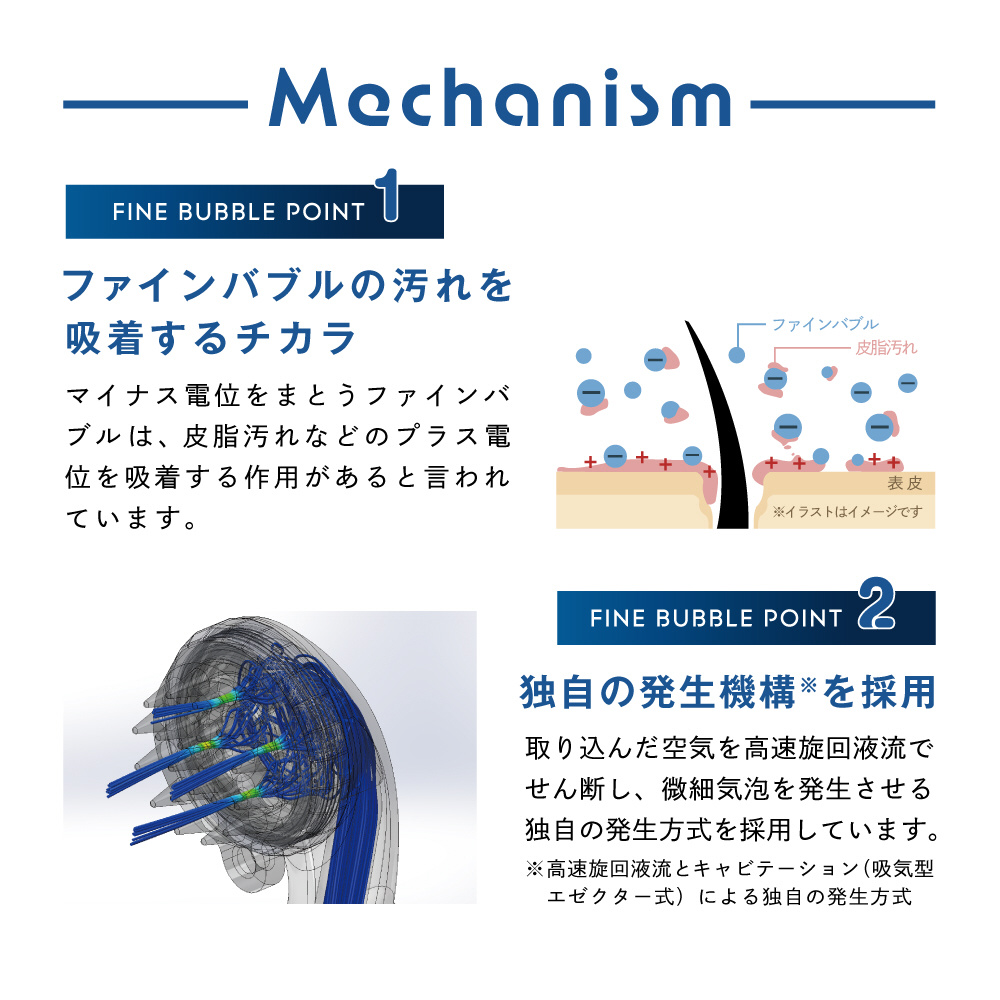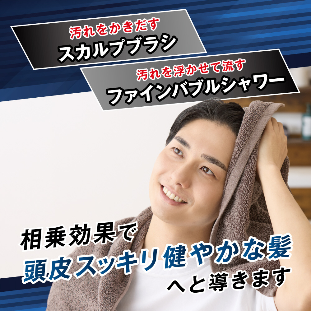 ファインバブルを含み、汚れに吸着して浮かせることで頭皮の洗浄を助け、スカルプブラシとの相乗効果で頭皮ケアをサポート。