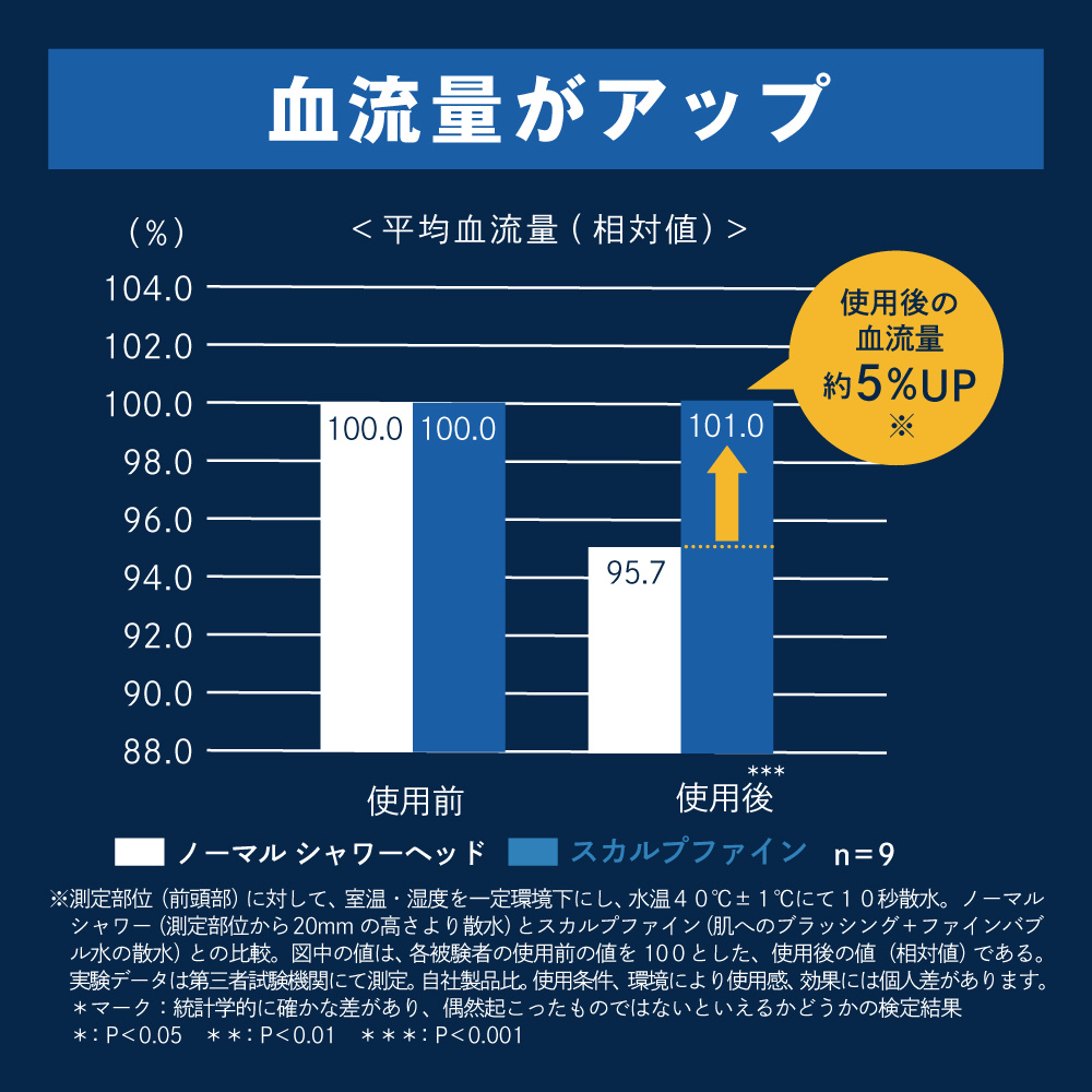 ブラシの刺激と水流・ファインバブルの作用により、通常のシャワーヘッドと比較して皮脂除去率は約15% UP(※1)、使用後の頭皮の平均血流量が約5% UPし血行促進(※2)、また使用後の肌表面温度は約23%UP(※3)!