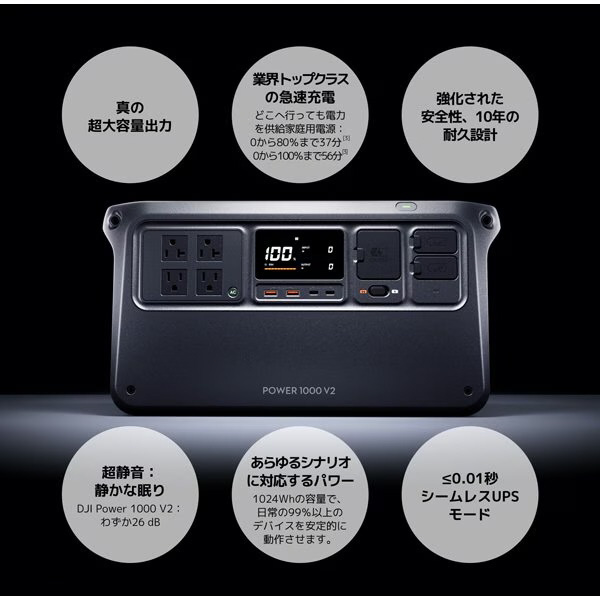 DJI Power 1000 V2は、2つのUSB-Aポートに、4つのAC出力ポート、1つのSDCポート、1つのSDC Liteポート、2つの1/4インチねじ込みポートを備えており、幅広い電力シナリオに対応する高い汎用性を提供します。さまざまなモデルのソーラーパネル、電源供給ケーブル、アダプターケーブルに接続でき、多様な充電および拡張ニーズに対応します。