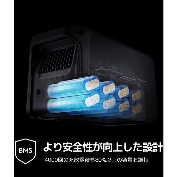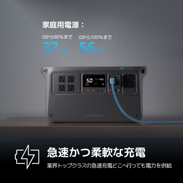 56分で完全充電、0〜80%をわずか37分で充電。家庭用電源、太陽光発電(ソーラーパネル)、車内電源で充電できます。屋内でも外出先でも、最適な充電方法を選択でき、信頼性の高い電源供給と一層の利便性を確保します。