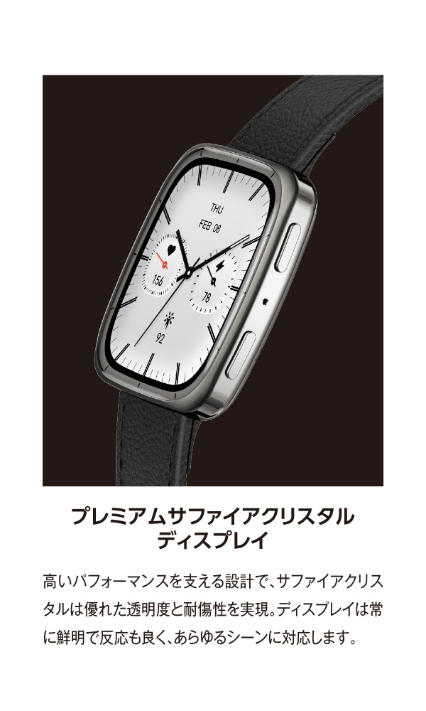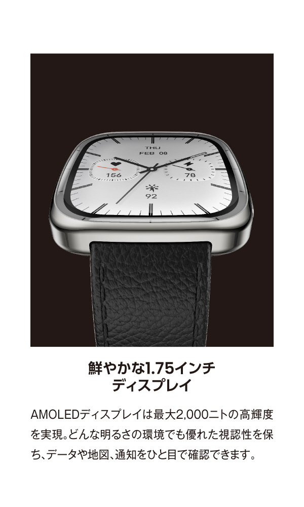 サファイアガラスや本革バンドの上質なデザインに、正確な健康管理を叶える最先端センサーを搭載。高精度GPS、160種以上のワークアウト対応で、ライフスタイルもアクティブもスマートに。