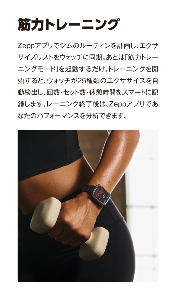 ウォーキングやランニングはもちろん、筋トレでは25種の動作を自動認識。
