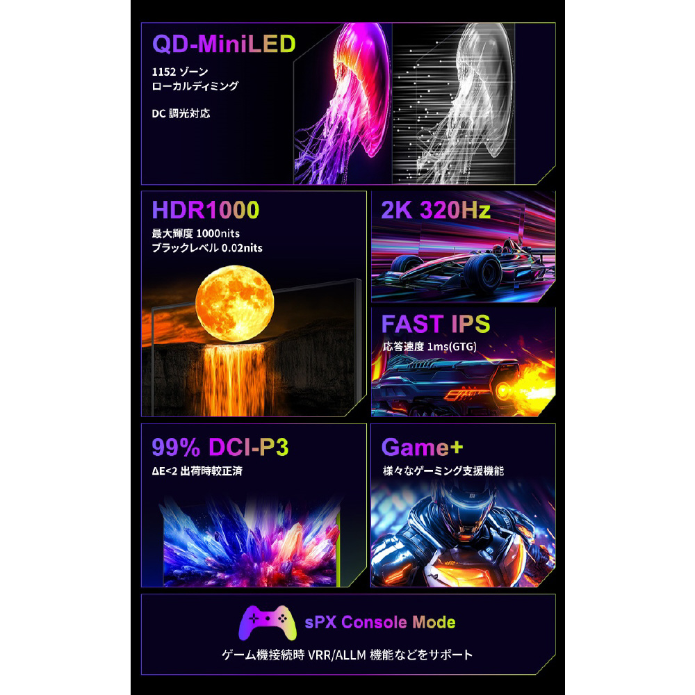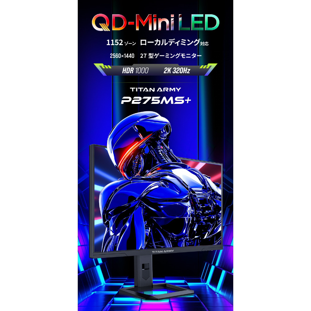 Titan Army P275MS+はMini LED、量子ドット技術を搭載し1152ゾーンのローカルディミングに対応した27型320Hz対応のハイエンドゲーミングモニターです。WQHD(2560×1440)の高解像度とDCI-P3 99%、Adobe RGB 99%の広色域に対応します。