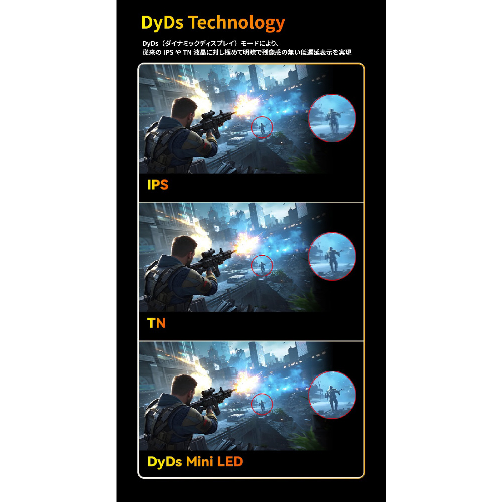 独自のDyDs(ダイナミックディスプレイ)モードにより高リフレッシュレート下での残像感を低減し、動きの激しい場面でも極めて明瞭な表示を実現します。