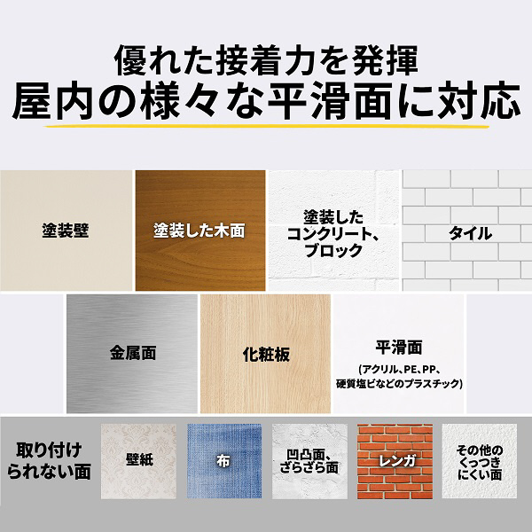 ●壁を傷めずにフレームやパネルなどが貼れる<BR>●キレイにはがせる、壁を傷つけない<BR>●最大耐荷重7kg、強力固定<BR>●位置決め簡単、フレームが浮かない、傾かない<BR>●樹脂製面ファスナーは繰り返し着脱可能<BR>●道具不要、簡単取付
