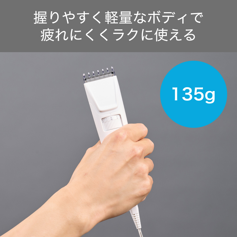 初めてでも簡単にホームカット。0.8mm〜24mmまで細かく調節しながらカットしやすい、パワフルな交流式のヘアカッターです。シンプルな機能と握りやすいボディでスムーズにセルフカットができます。 ※充電式ではありません。