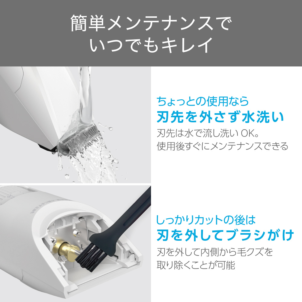 しっかりカットの後は、刃を外して内側から毛クズを取り除くことができます。