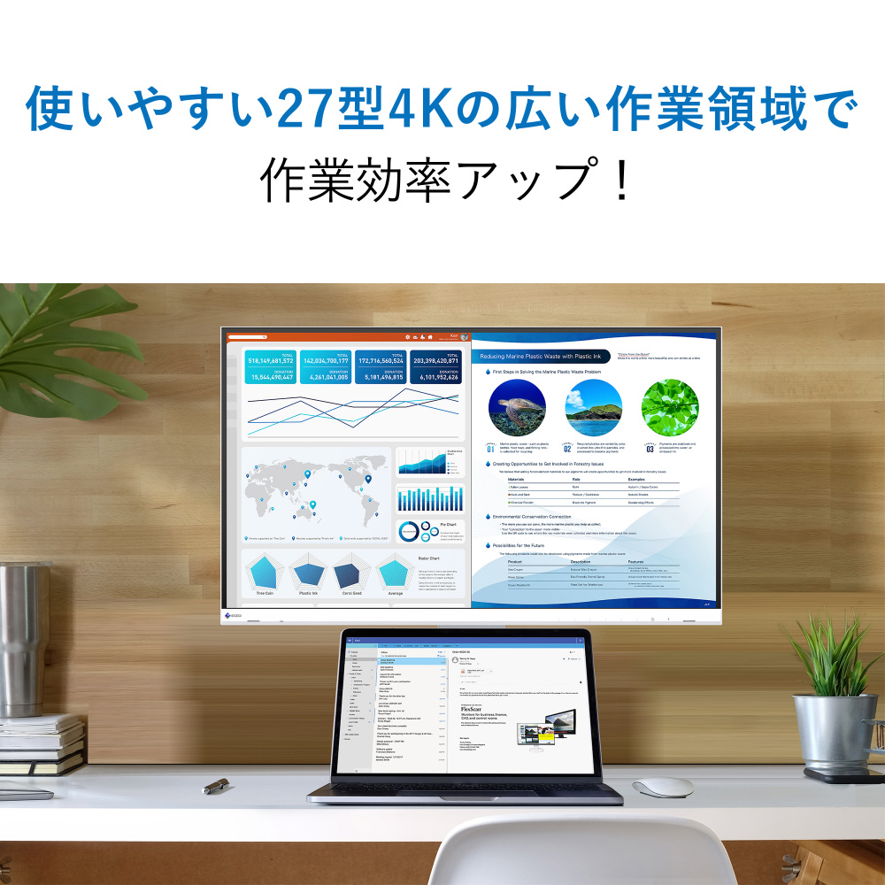 さまざまなウィンドウを同時に表示しながら作業をする際、一画面に表示できる情報量は生産性に直結します。EV2740Sは広い画面とコンパクトさを兼ね備えた27型サイズで4K(3840×2160)解像度に対応。フルHDの4倍の情報を一度に表示できるので、ウィンドウの切替えや画面のスクロールを頻繁に行う必要がなくなり、作業がはかどります。