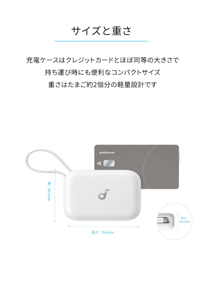 充電ケースはクレジットカードとほぼ同等の大きさで持ち運び時にも便利なコンパクトサイズ、重さはたまご約2個分の軽量設計です。