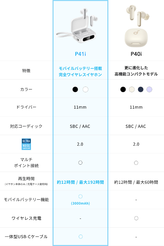 サイズ:約74.5×59.5×29.7mm、重さ:約114cs、充電方式:USB Type-C / ワイヤレス充電・充電時間:約1時間(イヤホン) / 約5時間(充電ケース*USB-Cケーブル使用時)、防水規格:IPX5・通信方式:Bluetooth 5.3、再生時間(通常モード):最大12時間(イヤホン本体のみ) / 最大192時間(充電ケース使用時)、再生時間(ノイズキャンセリングモード):最大10時間(イヤホン本体のみ) / 最大160時間(充電ケース使用時)、通話:最大7時間 (イヤホン本体のみ) / 最大112時間(充電ケース使用時)