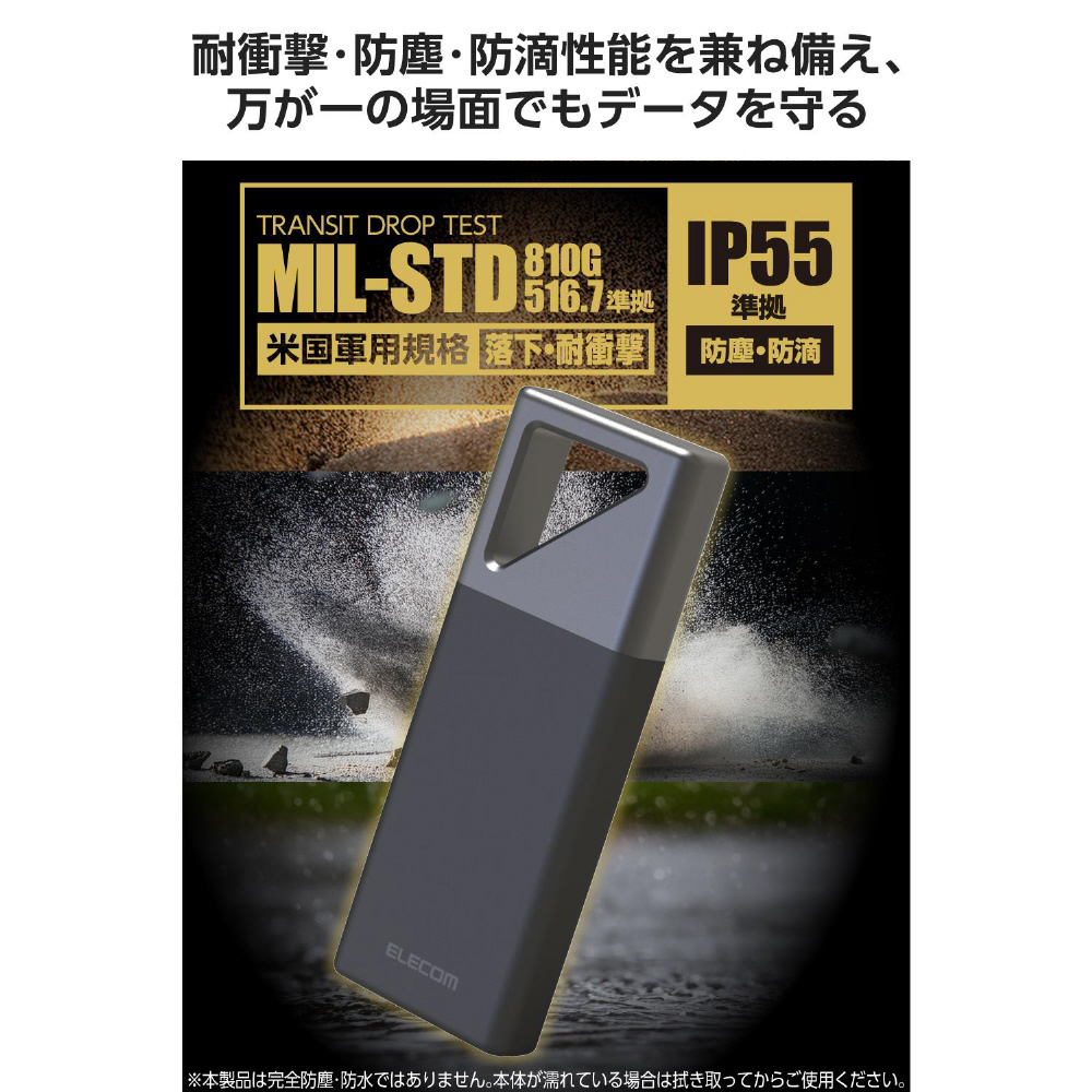 ■耐衝撃性と防塵・防滴性能により、落下や水濡れなどでもデータを守る