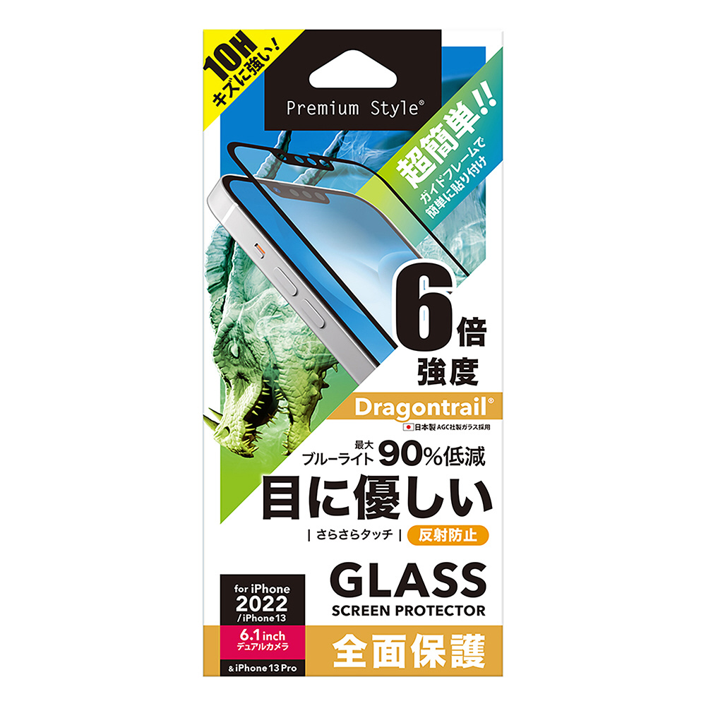 iPhone 16e/14/13/13 Pro用 ガイドフレーム付 液晶全面保護ガラス Premium Style ブルーライト低減/アンチグレア PG-22KGL040FBL