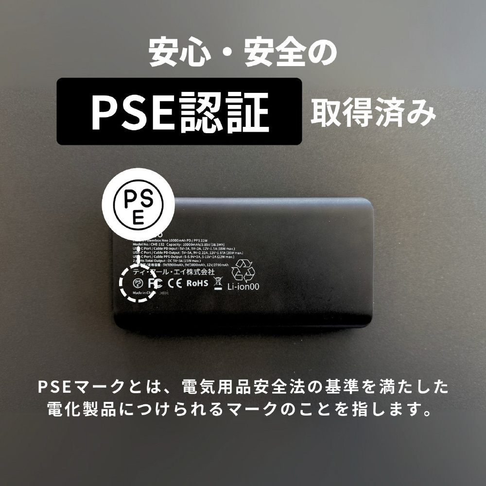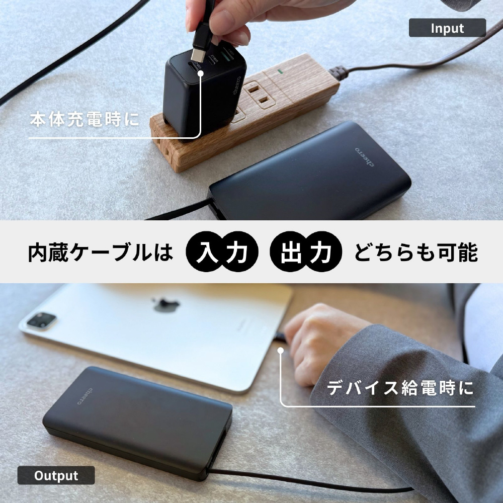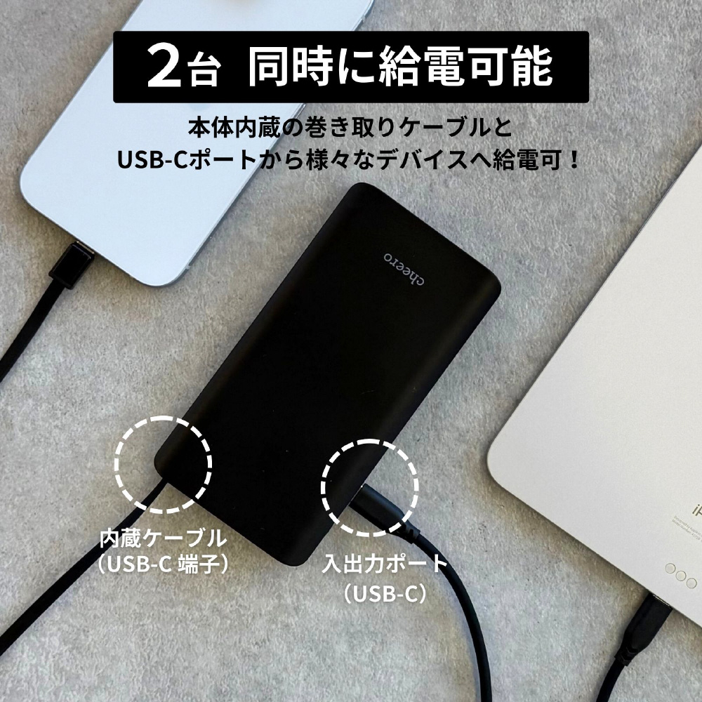 厚さ1.8cmで薄型ながら安心の大容量10000mAh。最大22W出力で急速充電対応。内蔵ケーブルと本体の出力ポートを使えば、2台同時充電も可能です。
