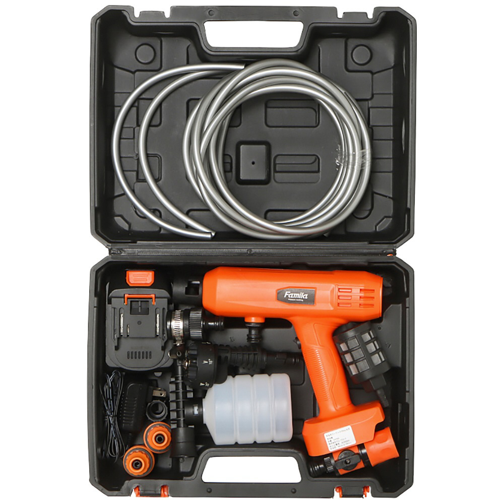 本体、バッテリー、充電用ACアダプター、6in1マルチノズル、泡用ボトル、500mlボトルホース、2Lボトルホース、バケツ給水用ホース(約5m)、水道直結用バルブ、蛇口アダプター、ホースコネクター×2、給水フィルター、ペットボトルアダプター、収納ケース