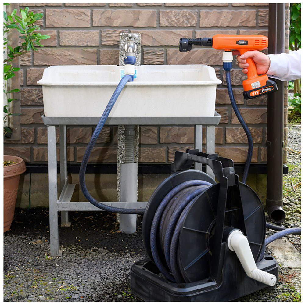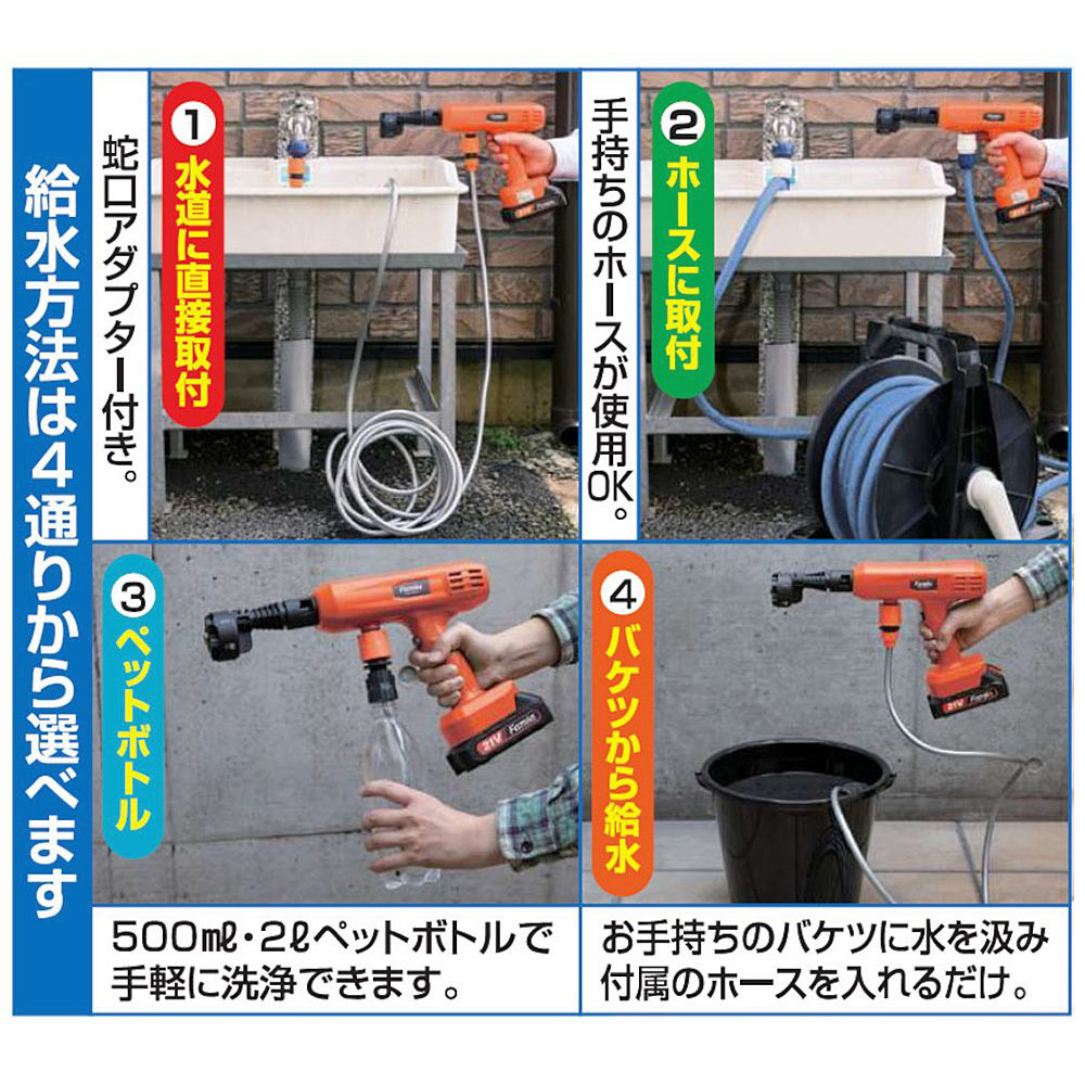 ●給水方法は4通りから選べます/1.水道に直接取付:蛇口アダプター付きなので水道に直結して使えます。2.ホースに取付:お手持ちのホースリールに繋いで使えます。3.ペットボトル:500ml・2Lペットボトルを専用ホースで取付できます。4.バケツから給水:お手持ちのバケツに水を汲み付属のホースを入れるだけ。