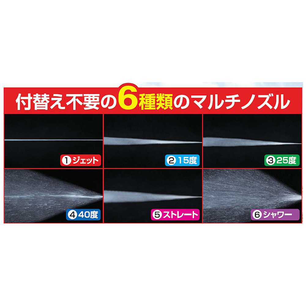 ●付替え不要の6種類のマルチノズル/ジェット、15度、25度、40度、ストレート、シャワー