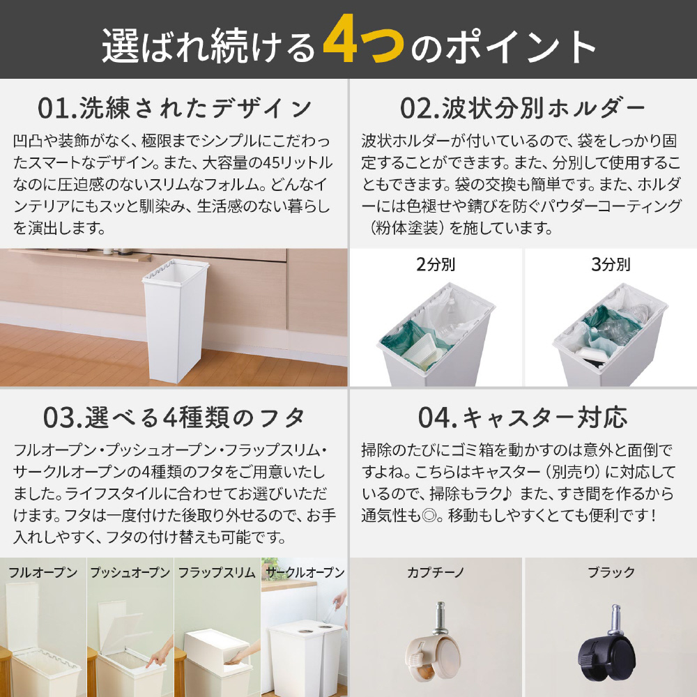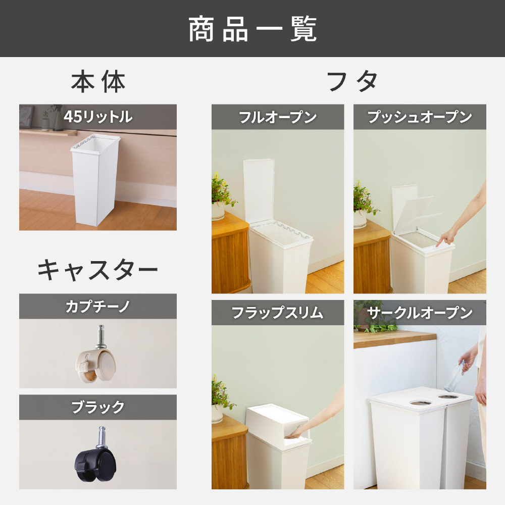 狭いところにも置けるスリムなゴミ箱。用途に応じて選べるフタは全4種類!