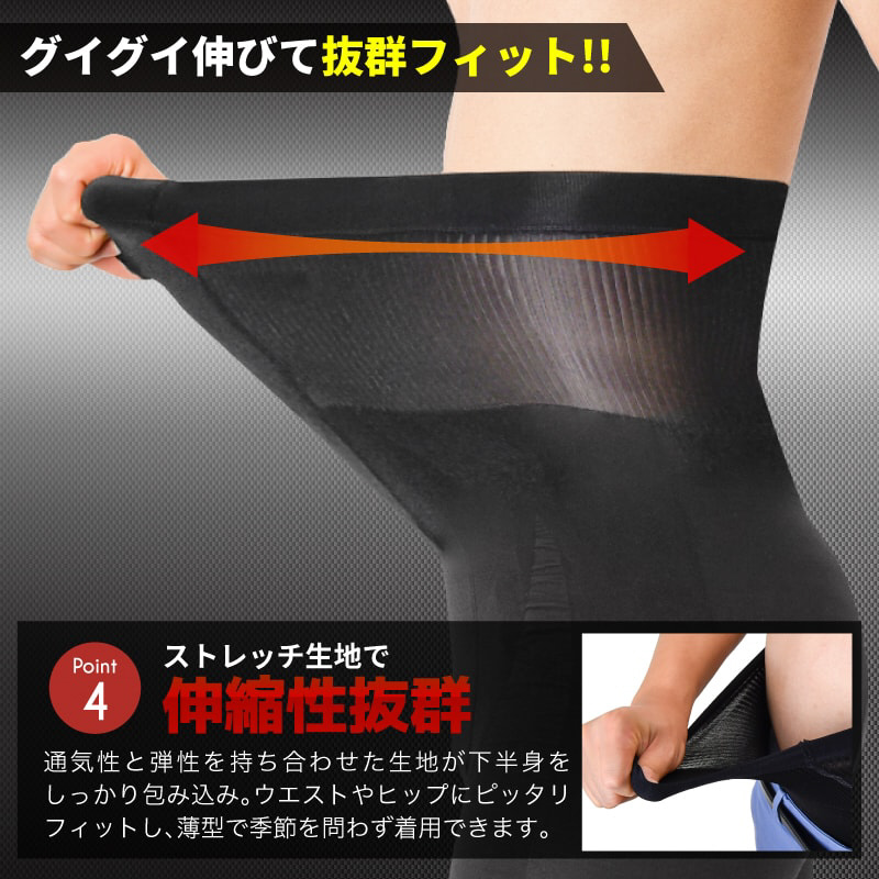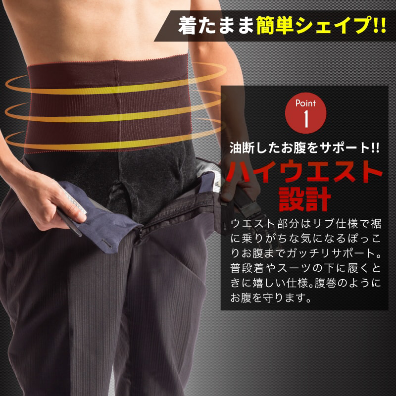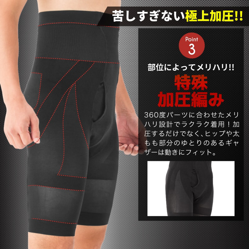 膝上からウエストまでサポートして、下半身それぞれの部位に合った特殊設計でボディを成形、自然な男らしいシルエットに。