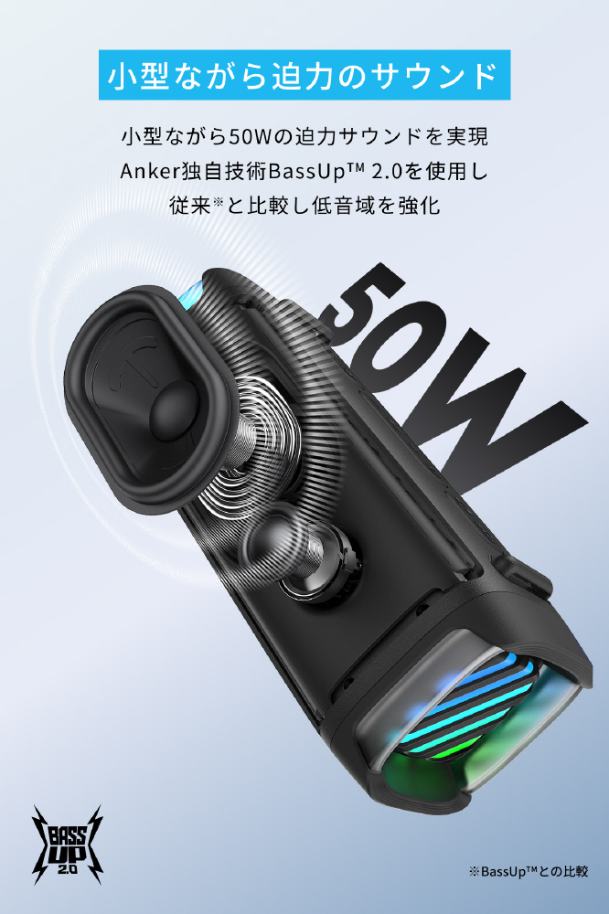 小型ながら50Wの迫力サウンドを実現。Anker独自技術BassUpTM2.0を使用し、従来 (※) と比較し低音域を強化。