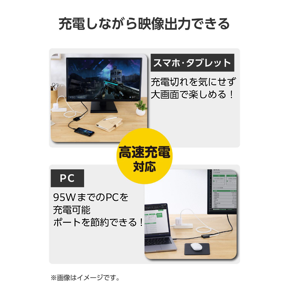 本製品のUSB Type-Cポート(充電専用)に、USB Power Delivery対応AC充電器などを接続することで、映像出力と同時にパソコンなどの端末を充電できます。最大100Wでの充電が可能です。