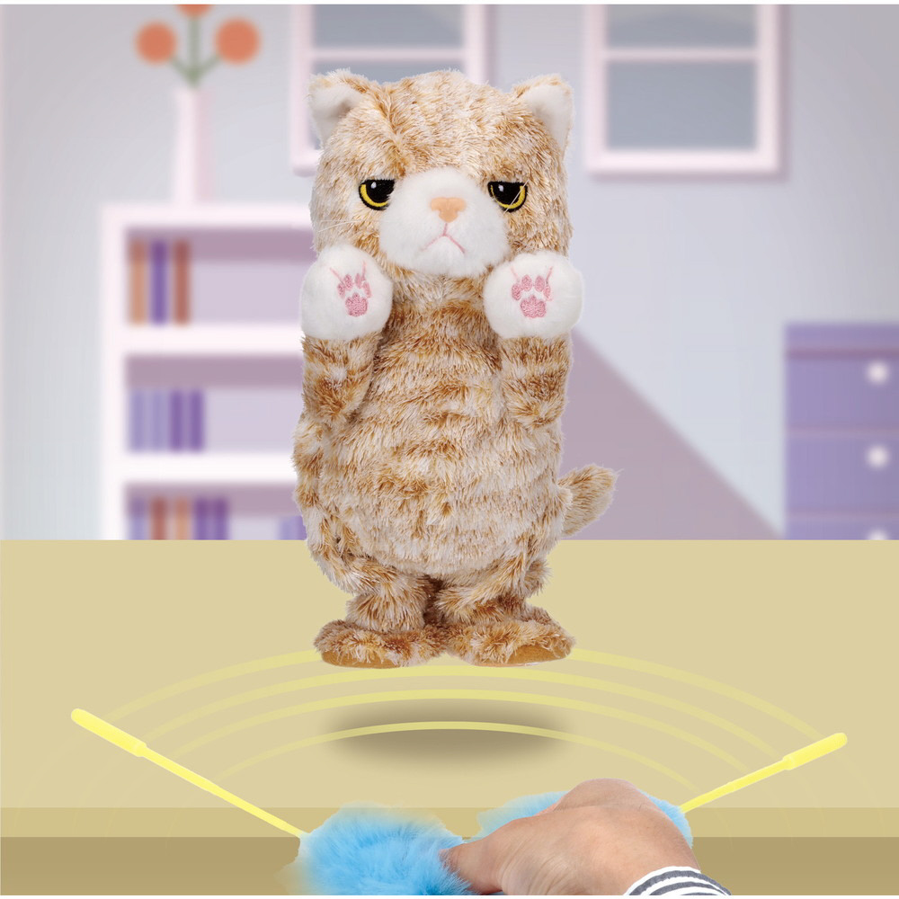 付属のねこじゃらしを顔の前でゆらすとネコちゃんがドラムロールにあわせてひざを曲げて、3連続ジャンプ!