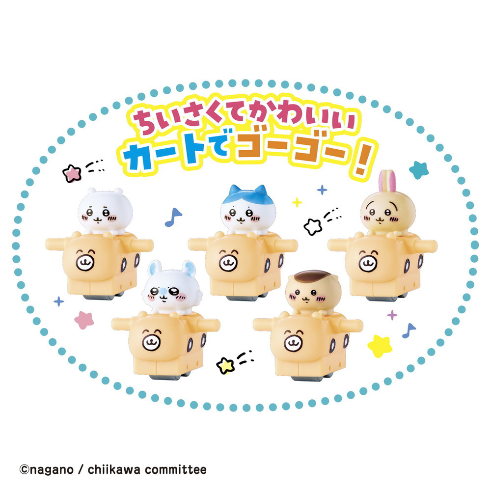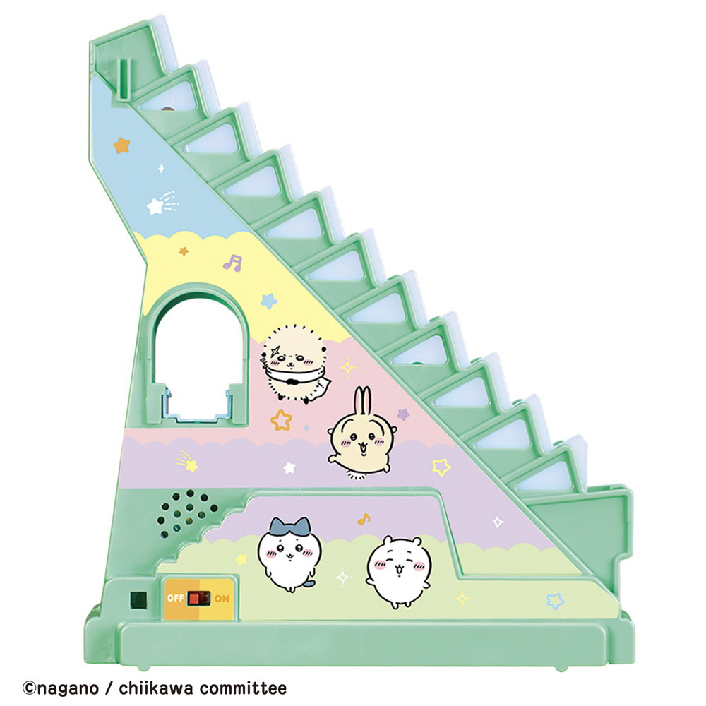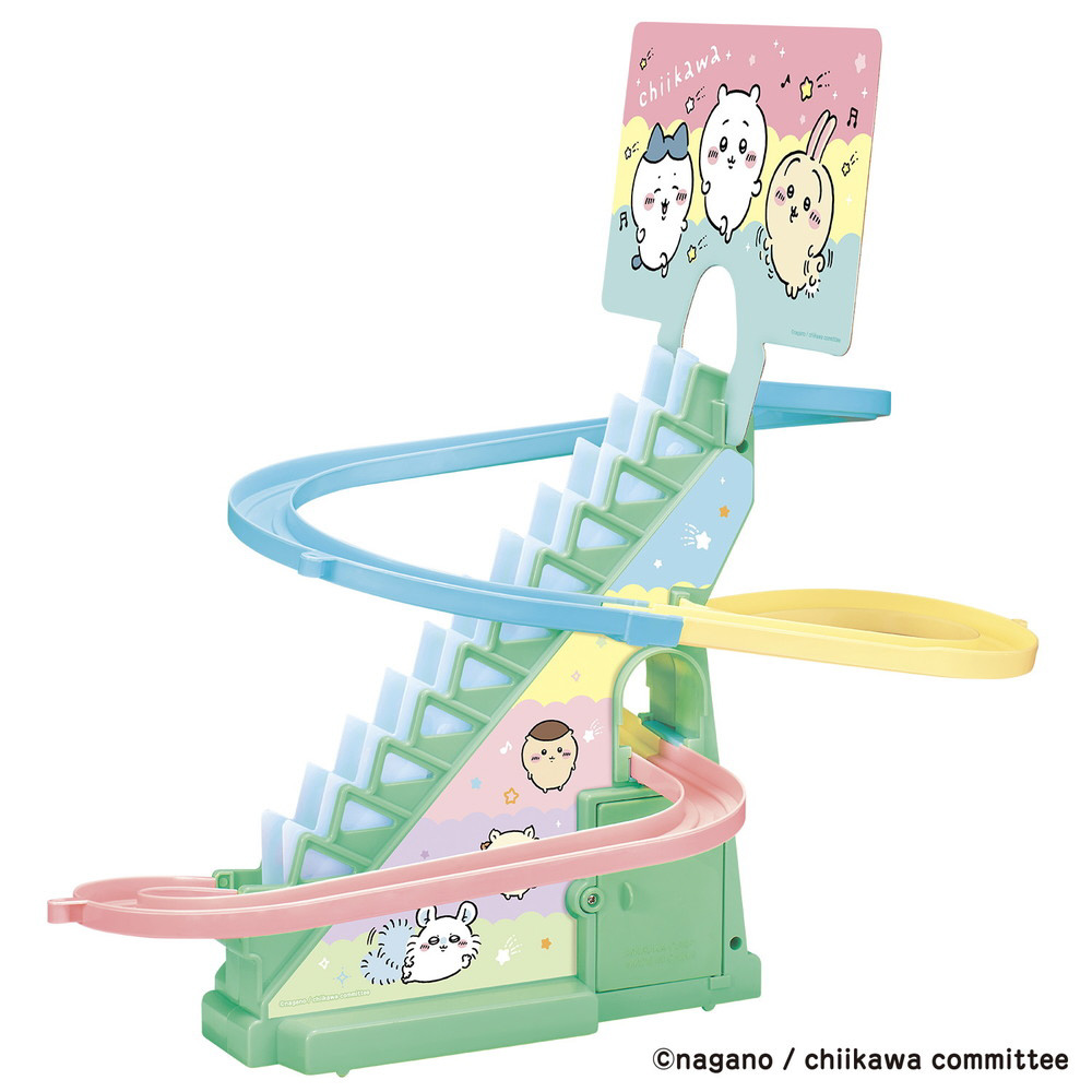 ちいかわ、ハチワレ、うさぎ、モモンガ、くりまんじゅうがかわいいカートに乗って階段をトコトコのぼり、コースを元気に走るコースターのおもちゃです。