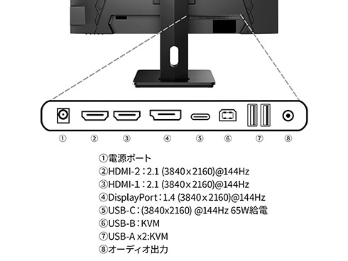 ■インターフェイスはHDMI 2.1 x2 (144Hz)とDisplayPort 1.4 x1 (144Hz)、さらにUSB-C x1 (144Hz/最大65W給電)を装備し、様々な機器との接続が可能です。USB-C(最大65W給電)は、対応のPCであればUSB-Cケーブル1本でモニターへの映像出力とノートPCへの給電が可能。ケーブル1本でスッキリ接続出来るだけでなく、テレワーク、出社併用の場合などノートPCのACアダプターを持ち運ぶ必要が無くなります。