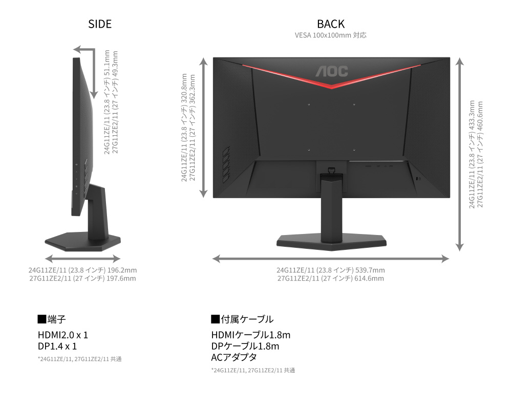 DisplayPortケーブル(1.8m)、HDMIケーブル(1.8m)、ACアダプター、スタンド、ベース、保証書、ケーブル付属リスト。