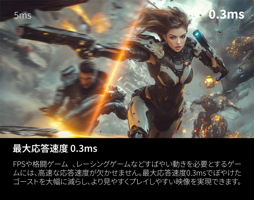 圧倒的な没入感。高みを目指し、戦場を支配するあなたへ!240Hzのリフレッシュレートと0.3msの応答時間を備えたディスプレイは、プロゲーミングの基準に応える性能を提供します。目に見えるブレのない超スムーズな体験をお楽しみいただけるため、常に勝利の準備が整います。