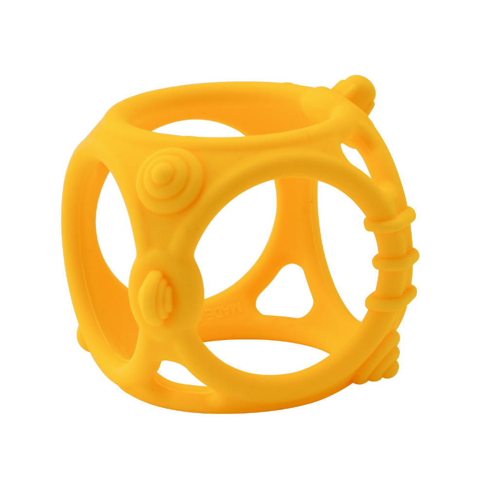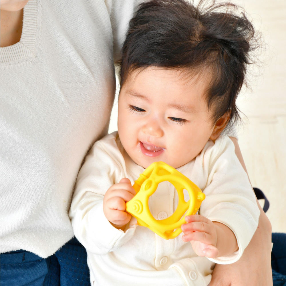 「なめる」「かむ」を存分に楽しんでもらうため、3か月の赤ちゃんでも自分で握って口に運びやすいかたちを追究したおもちゃ。