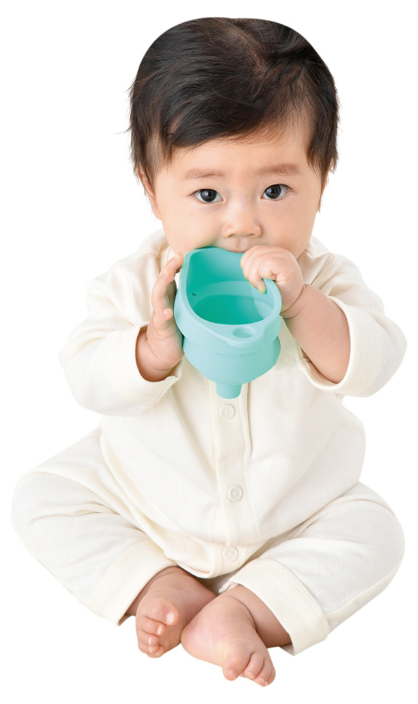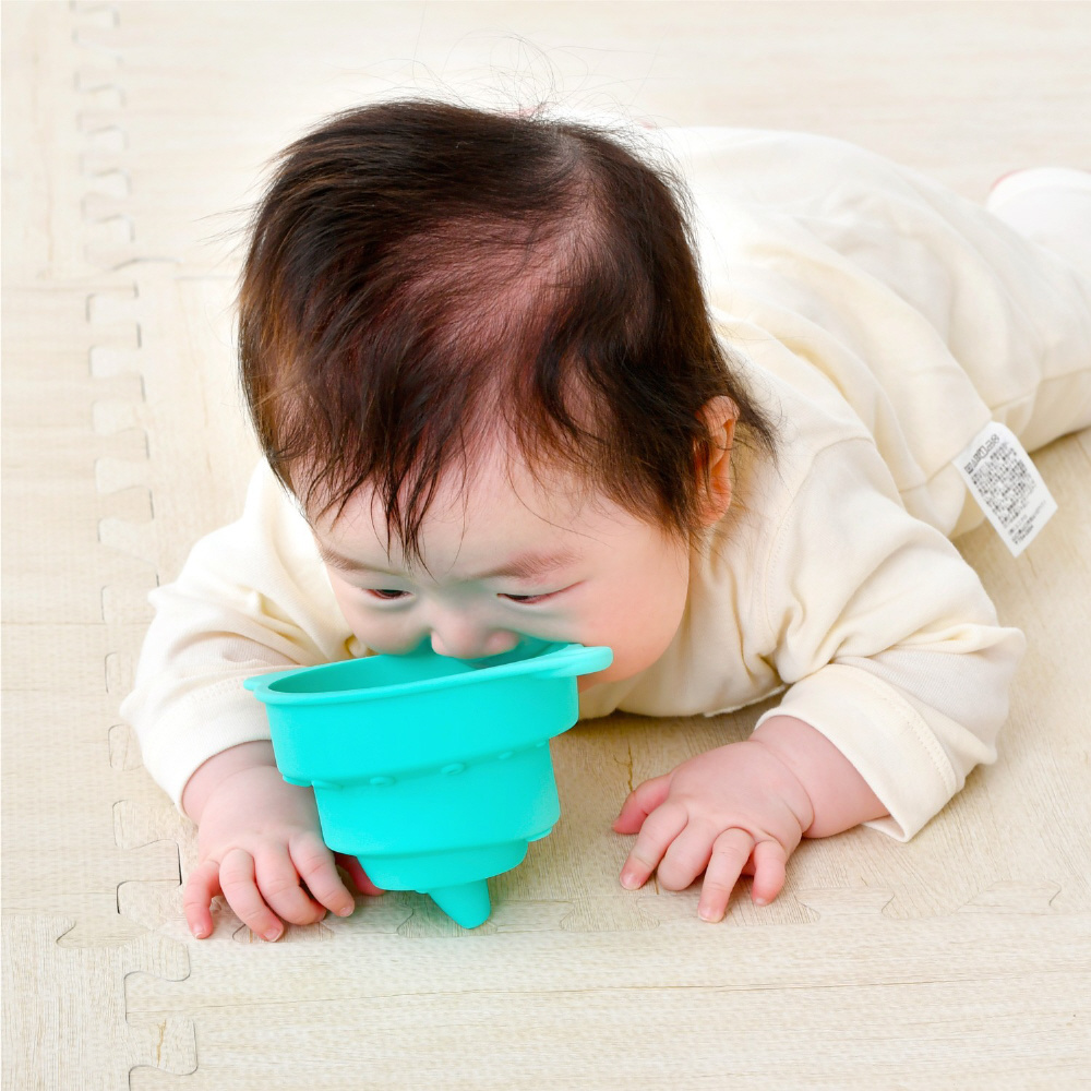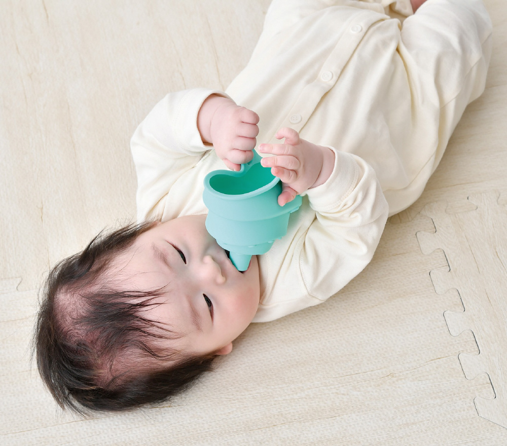 研究しつくされた形状と柔らかさで、歯が生え始めた赤ちゃんならでは「なめたい!」「かみたい!」に応えるおもちゃ。