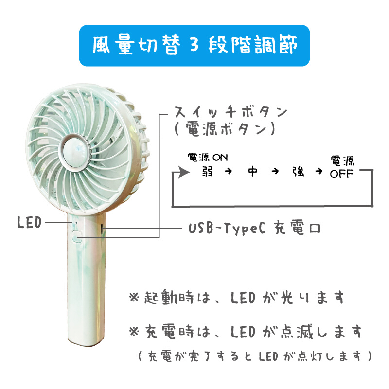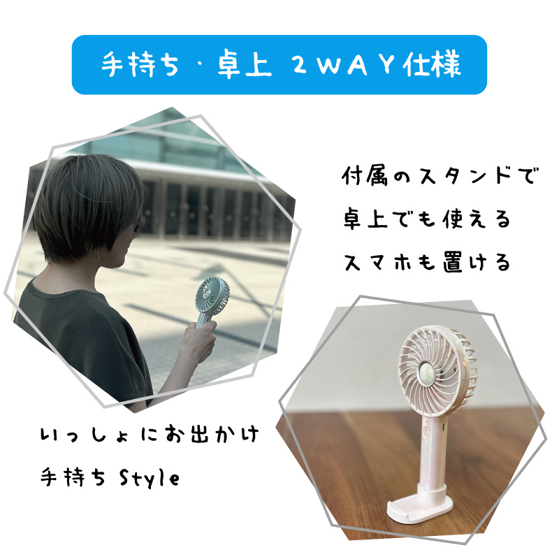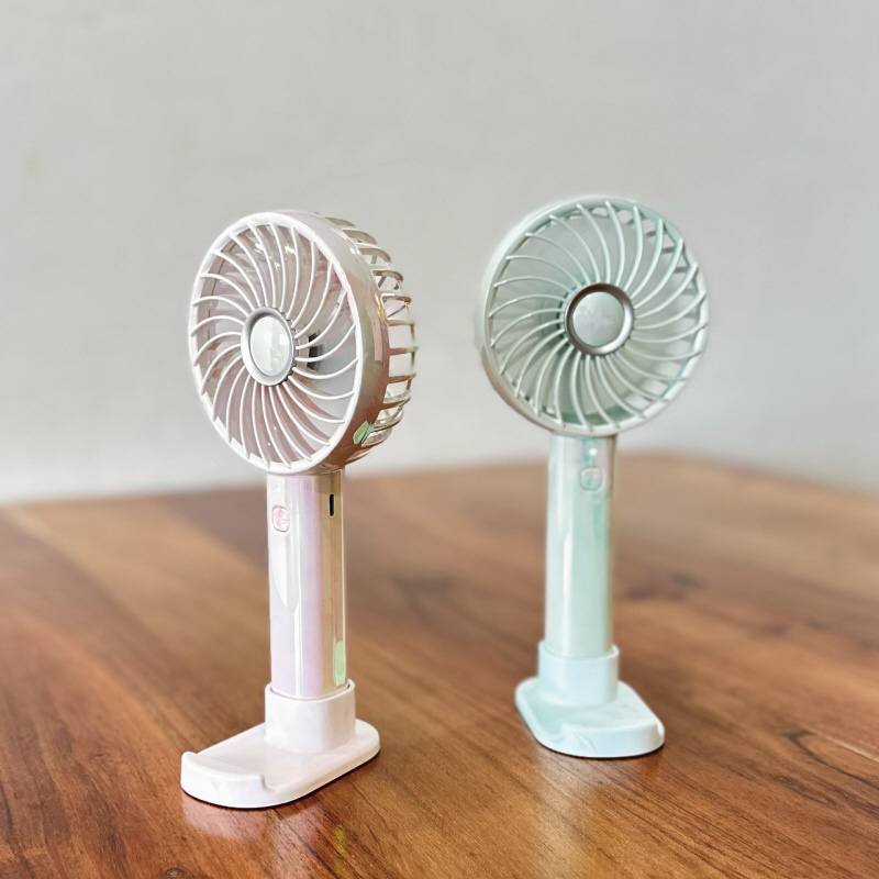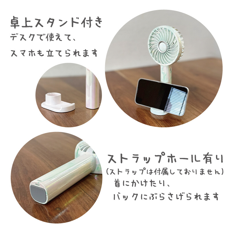 きらきらオーロラカラーの3段階風量切替付きパワフル送風ハンディファン。暑さ瞬間リセット!デスクで使用可能。スマホが置けるスタンド付き。